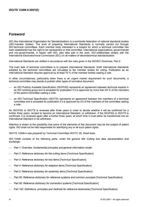 ISO/TS 13399-5:2007 is a technical specification published by the International Organization for Standardization (ISO). Its full title is "Cutting tool data representation and exchange — Part 5: Reference dictionary for assembly items". This standard covers: ISO/TS 13399-5:2007 specifies a reference dictionary for assembly items for cutting tools, together with their descriptive properties and domains of values. It specifies a reference dictionary that contains definitions and identifications of the classes of assembly items, with an associated classification scheme, definitions and identifications of the data element types that represent the properties of assembly items, and definitions and identifications of domains of values for describing the above data element types. The following is within the scope of ISO/TS 13399-5:2007: standard data that represent the various classes of assembly items; standard data that represent the various properties of assembly items; standard data that represent domains of values used for properties of assembly items; a single implementation method by which the standard data defined in ISO/TS 13399-5:2007 can be exchanged (see ISO 10303-21). The following is not within its scope: specialized or expert knowledge on the design and use of cutting tools; rules used to determine the information that should be communicated; applications where these standard data may be stored or referenced; implementation methods other than the one defined in ISO/TS 13399-5:2007 by which the standard data can be exchanged and referenced; information models for cutting tools; definitions of classes and properties for cutting items, tool items, adaptive items, reference systems and common concepts, or for connection systems, these being covered by other parts of ISO 13399; definitions of items for general engineering use that may be specified by other organizations and included in other dictionaries approved by ISO.