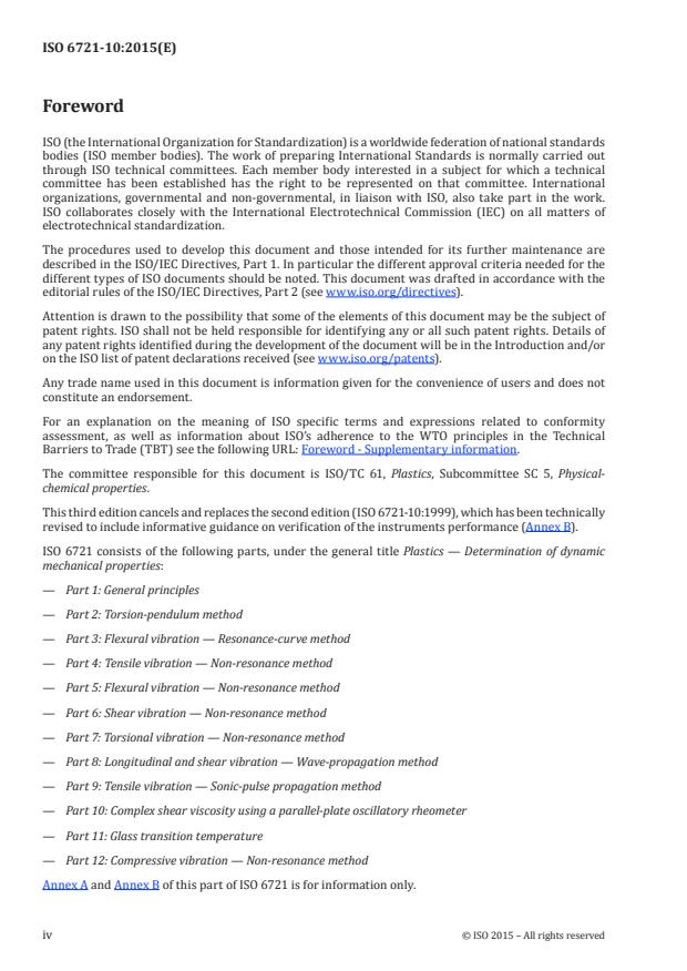 ISO 6721-10:2015 - Plastics - Determination of dynamic mechanical properties - Part 10: Complex shear viscosity using a parallel-plate oscillatory rheometer - defines a standardized method to measure the dynamic rheological behavior of polymer melts using a parallel-plate oscillatory rheometer. The method covers determination of complex shear viscosity (η*), its real and imaginary parts (η′, η″), complex shear modulus (G*), shear storage modulus (G′) and shear loss modulus (G″), typically over angular frequencies from 0.01 rad·s⁻¹ to 100 rad·s⁻¹ and for complex shear viscosity values up to around ~10 MPa·s.