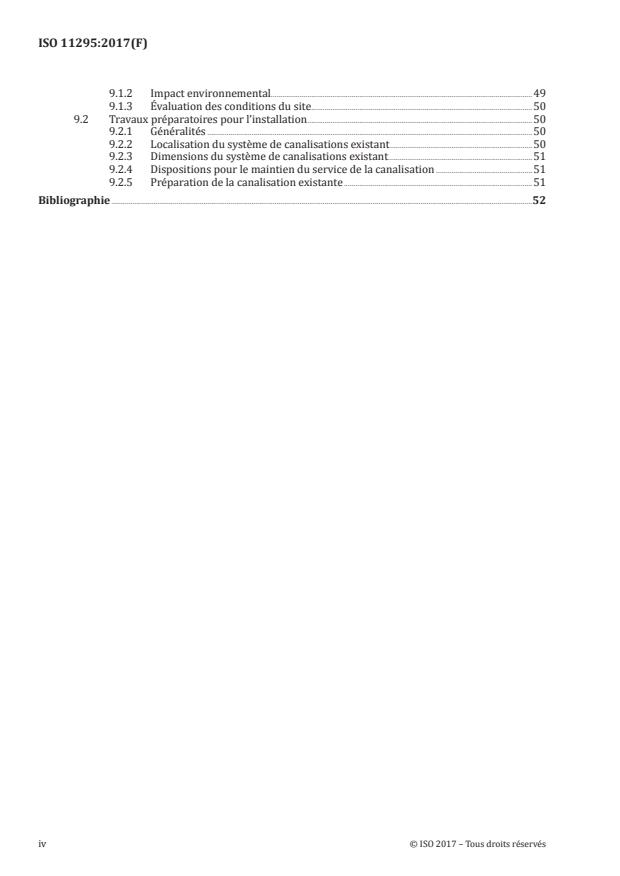 L'ISO 11295 :2017 définit et décrit les familles de techniques de rénovation et de remplacement sans tranchée (sur ou hors ligne d'une canalisation existante) des canalisations sans pression et sous pression au moyen de tuyaux en plastique, y compris en composites en plastique formés in situ dans les tuyaux, de raccords et d'accessoires en plastique. Elle ne couvre pas les constructions neuves réalisées comme extension d'un réseau. Pour chaque famille de techniques, elle identifie des zones d'application, ce qui comprend, sans toutefois s'y limiter, les branchements et les collecteurs d'assainissement enterrés et les réseaux enterrés d'alimentation en eau et la distribution de gaz. L'ISO 11295 :2017 fournit des informations sur les principes, mais pas sur les méthodologies détaillées, de conception des systèmes de canalisations en plastique utilisés pour la rénovation ou le remplacement sans tranchée de canalisations existantes. Ces informations couvrent: - l'état de la canalisation existante et du site; - les fonctions de la nouvelle canalisation; - les performances structurelles; - les performances hydrauliques; - les aspects relatifs à l'installation et l'incidence du site; - les autres facteurs influant sur le choix de la technique de rénovation ou de remplacement sans tranchée. Les travaux qui doivent être effectués sur la canalisation existante avant la rénovation et/ou le remplacement sans tranchée ne relèvent pas du domaine d'application du présent document. L'ISO 11295 :2017 fournit les informations nécessaires afin de déterminer les options viables et d'identifier la technique optimale eu égard à un ensemble donné d'objectifs de réhabilitation. NOTE Il est de la responsabilité du concepteur de choisir et de concevoir le système de rénovation ou de remplacement sans tranchée. L'ISO 11295 :2017 ne spécifie pas les méthodes de calcul visant à déterminer, pour chacune des techniques viables, la quantité requise de matériau de tubage ou de tuyaux de remplacement nécessaire pour garantir les performances souhaitées de la canalisation réhabilitée.