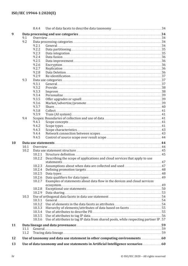 — Data taxonomies, data categories and data use statement structure (Clauses 8, 9 and 10).