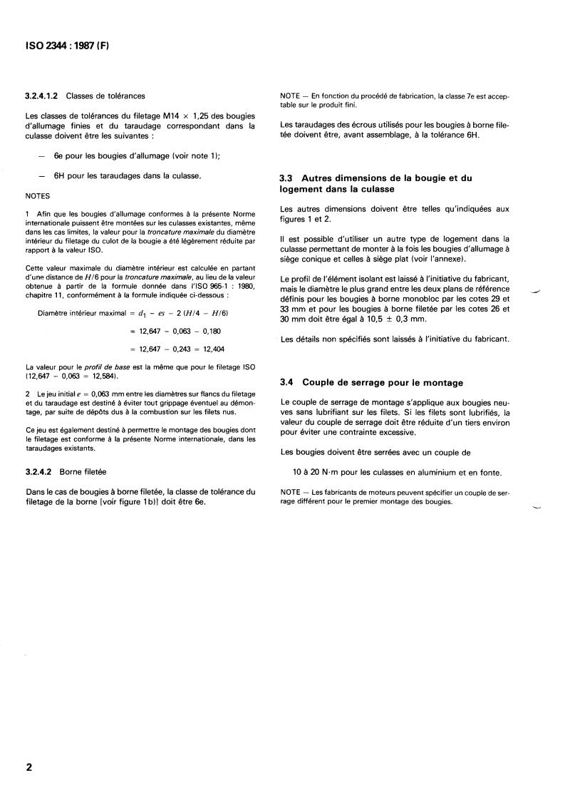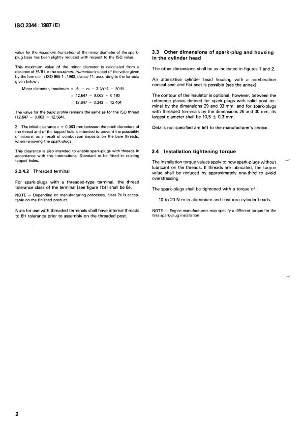 ISO 2344:1987 is a standard published by the International Organization for Standardization (ISO). Its full title is "Road vehicles — M14 x 1,25 spark-plugs with conical seating and their cylinder head housing". This standard covers: Road vehicles — M14 x 1,25 spark-plugs with conical seating and their cylinder head housing