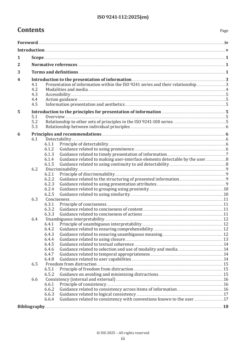 ISO 9241-112:2025 is a standard published by the International Organization for Standardization (ISO). Its full title is "Ergonomics of human-system interaction - Part 112: Principles for the presentation of information". This standard covers: This document establishes ergonomic design principles for interactive systems related to the software-controlled presentation of information by user interfaces. It applies to the three main modalities (visual, auditory, tactile or haptic) typically used in information and communication technology (ICT). These principles apply to the perception and understanding of presented information. These principles are applicable in the analysis, design and evaluation of interactive systems. This document also provides recommendations corresponding to the principles. The recommendations for each of the principles are not exhaustive and are not necessarily independent from one another. While this document is applicable to all types of interactive systems, it does not cover the specifics of particular application domains which require context-specific recommendations. This document also applies to outputs from interactive systems (such as printed documents and document exports in common computer formats, e.g. pdf, text and tabular formats).