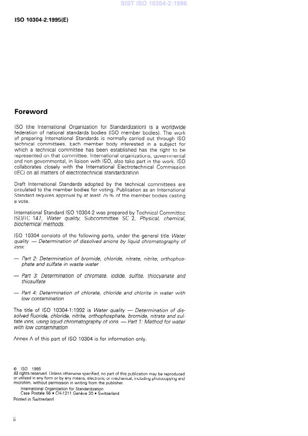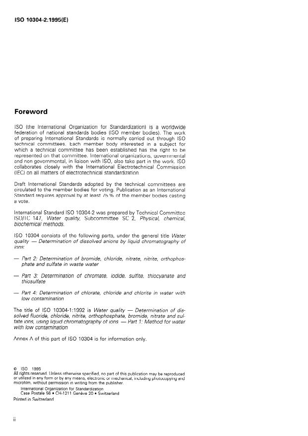 ISO 10304-2:1995 is a standard published by the International Organization for Standardization (ISO). Its full title is "Water quality — Determination of dissolved anions by liquid chromatography of ions — Part 2: Determination of bromide, chloride, nitrate, nitrite, orthophosphate and sulfate in waste water". This standard covers: Specifies a method for the determination of the dissolved anions bromide, chloride, nitrate, nitrite, orthophosphate and sulfate in waste waters.