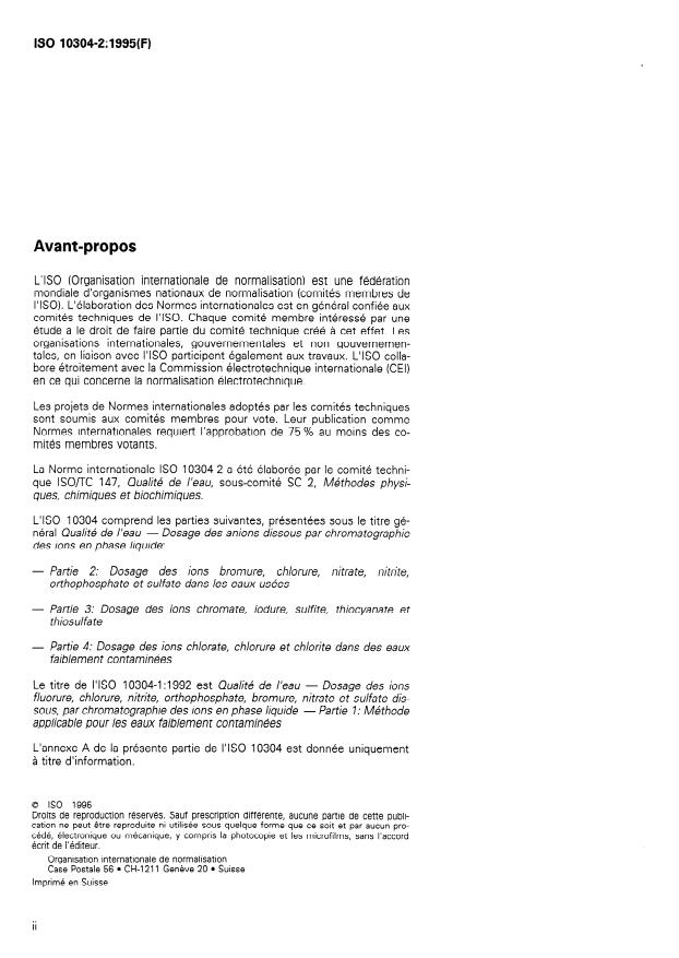 ISO 10304-2:1995 - Qualité de l'eau -- Dosage des anions dissous par chromatographie des ions en phase liquide