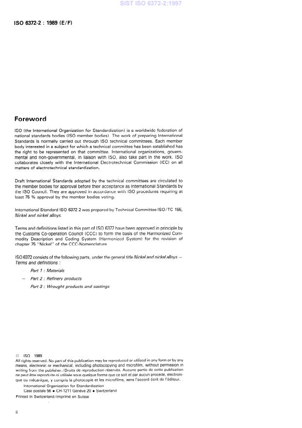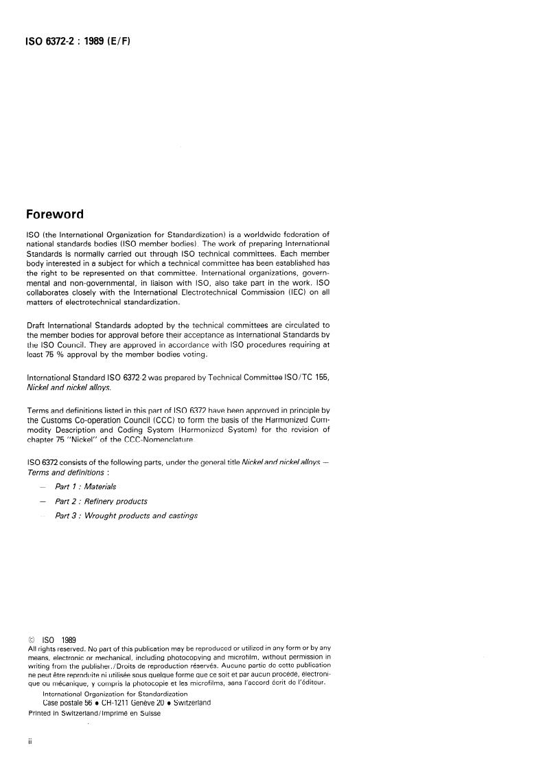 ISO 6372-2:1989 is a standard published by the International Organization for Standardization (ISO). Its full title is "Nickel and nickel alloys — Terms and definitions — Part 2: Refinery products". This standard covers: Terms and definitions listed in this part of ISO 6372 have been approved by the CCC (Customs Co-operation Council) to form the basis for the revision of chapter 75 "Nickel" of the CCC-Nomenclature. The three parts have been published bilingual (E/F). This part of ISO 6372 gives terms for and definitions of refinery shapes and intermediate products of metallurgy, in the field of nickel and nickel alloys.
