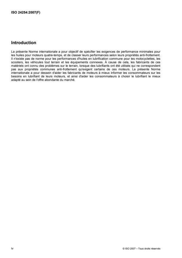 L'ISO 24254:2007 spécifie les exigences pour les huiles lubrifiantes pour moteurs (désignées par la suite comme «huiles pour moteurs quatre-temps»), à utiliser dans les moteurs quatre-temps à allumage commandé fonctionnant à l'essence et munis d'un carter à huile commun pour la lubrification du moteur et celle du système de transmissions associé (boîte de vitesses, embrayage, démarreur), montés dans les motocyclettes, scooters, véhicules tout terrain et équipements connexes. La classification des huiles pour moteurs quatre-temps est définie dans l'ISO 6743-15. Parmi toutes les catégories couvertes par l'ISO 6743-15, la présente spécification comprend les catégories EMA et EMB. L'ISO 24254:2007 spécifie la classification de performance des huiles pour moteurs à essence quatre-temps en se basant sur des propriétés physico-chimiques et sur trois indices de performance en frottement qui sont déduits des propriétés anti-frottement des huiles selon la méthode de la JASO T904.