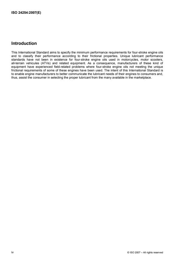ISO 24254:2007 specifies the requirements of lubricating engine oils (hereinafter referred to as “four-stroke engine oils”) to be used in four-stroke cycle spark ignition gasoline engines employing a common sump containing the lubricating oil for both the engine and associated drivetrain (transmission, clutch, starter) of motorcycles, motor scooters, all-terrain vehicles (ATVs) and related equipment. Classification of four-stroke engine oils is defined in ISO 6743-15. The performance requirements of four-stroke engine oils classified in all of the categories covered by ISO 6743-15, EMA and EMB, are embraced in this specification. ISO 24254:2007 specifies the performance classification of four-stroke cycle gasoline engine oils, based on physical and chemical properties, and three friction performance indices, which are derived from the frictional properties of the lubricant, according to the JASO T904 test procedure.