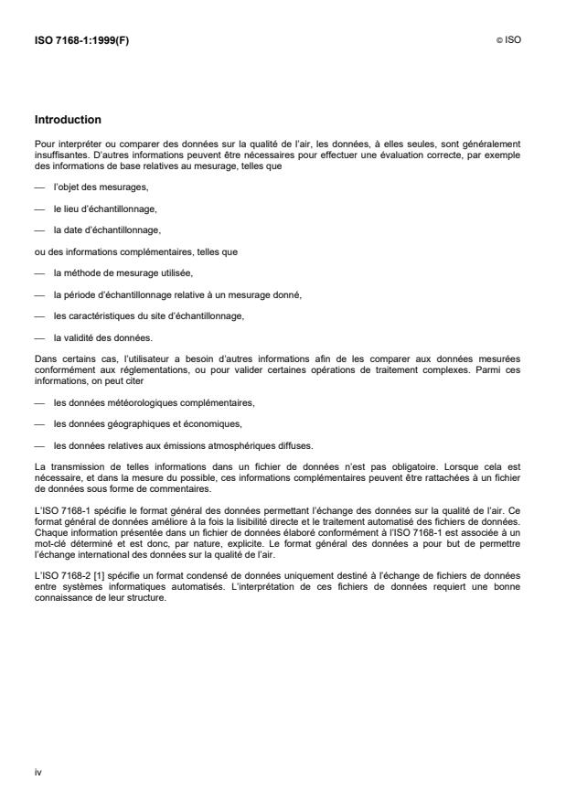 ISO 7168-1:1999 is a standard published by the International Organization for Standardization (ISO). Its full title is "Air quality - Exchange of data - Part 1: General data format". This standard covers: La présente partie de l'ISO 7168 spécifie un format général pour l'échange des données sur la qualité de l'air et des informations connexes. Elle définit des mots-clés obligatoires et facultatifs destinés à identifier les données présentées dans un fichier de données, ainsi que les valeurs et formats des données associées à un mot-clé.La présente partie de l'ISO 7168 est recommandée pour l'échange international des données sur la qualité de l'air. Elle concerne également l'importation directe de données, par exemple dans des feuilles de calcul électroniques.