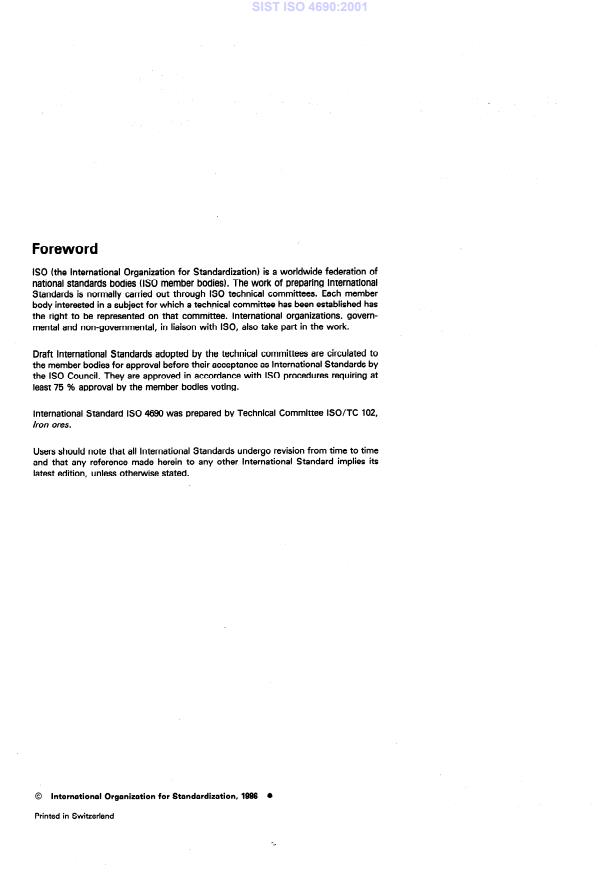 ISO 4690:1986 is a standard published by the International Organization for Standardization (ISO). Its full title is "Iron ores — Determination of sulfur content — Combustion method". This standard covers: The method ist applicable to a concentration range of 0,002 to 0,25 % (m/m) of sulfur in natural iron ores, and iron ore concentrates and agglomerates including sinter products. The results are not affected by the presence of fluoride. Specifies principle, reagents, apparatus, sampling and samples, procedure, expression of results, and test report. ISO 4690 includes three annexes.