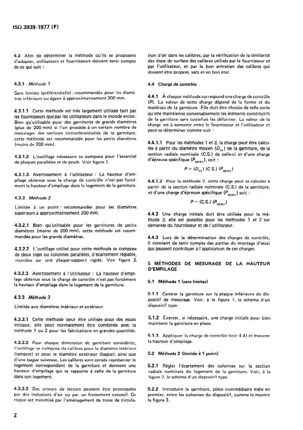 ISO 3939:1977 is a standard published by the International Organization for Standardization (ISO). Its full title is "Fluid power systems and components — Multiple lip packing sets — Methods for measuring stack heights". This standard covers: Specifies methods for measuring sealing devices having more than one seal in the set. Specifies methods for measuring stack height in order to determine that the sets are to an acceptable dimensional standard. Does not specify the dimensions for packing sets or their components. Describes three acceptable methods, and figure 1 shows a typical measuring device for the methods 1 and 2, the figures 3 and 4 show a typical setup for the methods 2 and 3, and figure 2 shows a typical device for the method 2.
