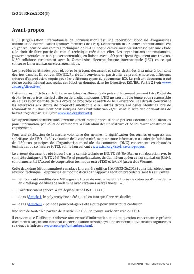 ISO 1833-26:2020 is a standard published by the International Organization for Standardization (ISO). Its full title is "Textiles — Quantitative chemical analysis — Part 26: Mixtures of melamine with certain other fibres (method using hot formic acid)". This standard covers: This document specifies a method using hot formic acid to determine the mass percentage of melamine fibres after removal of non-fibrous matter, in textiles made of mixtures of: — melamine fibres with — cotton, polypropylene or aramid fibres.