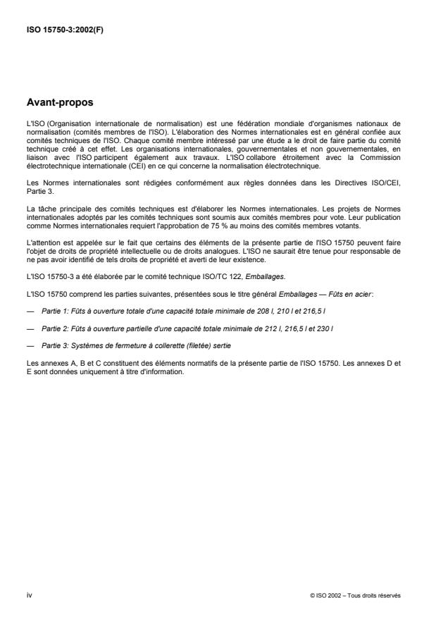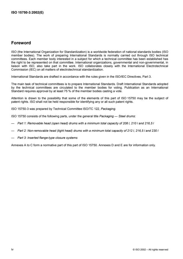 ISO 15750-3:2002 is a standard published by the International Organization for Standardization (ISO). Its full title is "Packaging — Steel drums — Part 3: Inserted flange-type closure systems". This standard covers: This part of ISO 15750 specifies the characteristics, dimensions and finish of the inserted flange-type closure systems used for steel drums.