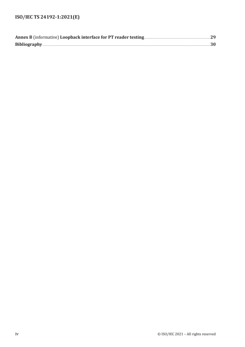 ISO/IEC TS 24192-1:2021 is a technical specification published by the International Organization for Standardization (ISO). Its full title is "Cards and security devices for personal identification - Communication between contactless readers and fare media used in public transport - Part 1: Implementation requirements for ISO/IEC 14443 (all parts)". This standard covers: This document defines the technical requirements to be met by contactless public transport (PT) devices in order to be able to interface together using the ISO/IEC 14443 (all parts) contactless communications protocol. This document applies to PT devices: - PT readers which are contactless fare management system terminals acting as a PCD contactless reader based on ISO/IEC 14443 (all parts); - PT objects which are contactless fare media acting as a PICC contactless object based on ISO/IEC 14443 (all parts). This document addresses interoperability of consumer-market NFC mobile devices, compliant to NFC Forum specifications, with above mentioned PT devices, aligns with ISO/IEC 14443 (all parts) and does not seek to limit compliance for PT readers with EMV Contactless Interface Specification.