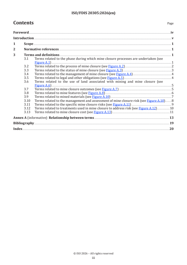 Keywords: ISO/FDIS 20305, mine closure, reclamation, mining vocabulary, environmental rehabilitation, mine closure management, mine rehabilitation, mining standards, ISO mining standards, mine closure risk, mining governance, land reuse, closure costs.
