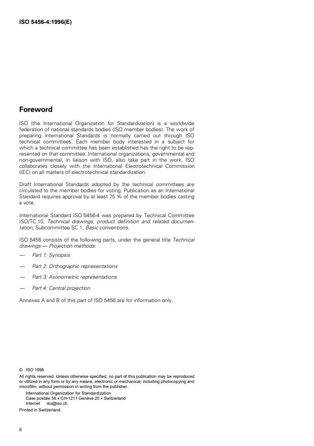 ISO 5456-4:1996 - Technical drawings - Projection methods - Part 4: Central projection defines rules and practical methods for creating perspective (central) projections in technical drawings. Published in 1996 as part of the ISO 5456 series, this part covers terminology, symbols, projection geometry and several depiction methods used to produce realistic pictorial representations from a finite projection centre onto a projection plane.