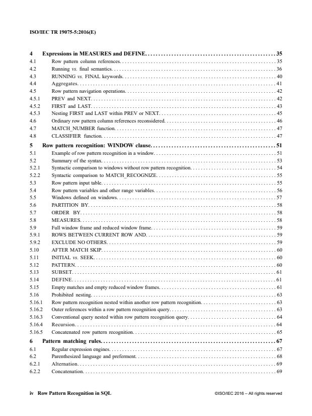 ISO/IEC TR 19075-5:2016 is a technical report published by the International Organization for Standardization (ISO). Its full title is "Information technology — Database languages — SQL Technical Reports — Part 5: Row Pattern Recognition in SQL". This standard covers: ISO/IEC TR 19075-5:2016 discusses the syntax and semantics for recognizing patterns in rows of a table, as defined in [ISO 9075-2].