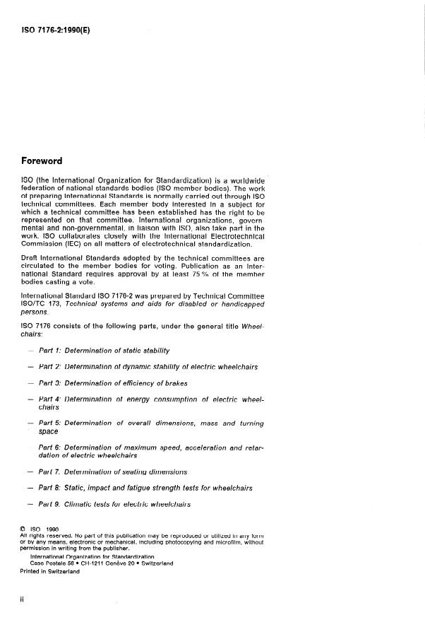ISO 7176-2:1990 is a standard published by the International Organization for Standardization (ISO). Its full title is "Wheelchairs — Part 2: Determination of dynamic stability of electric wheelchairs". This standard covers: Wheelchairs — Part 2: Determination of dynamic stability of electric wheelchairs
