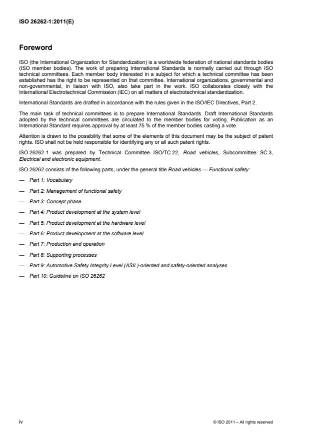 ISO 26262-1:2011 is a standard published by the International Organization for Standardization (ISO). Its full title is "Road vehicles — Functional safety — Part 1: Vocabulary". This standard covers: ISO 26262 is intended to be applied to safety-related systems that include one or more electrical and/or electronic (E/E) systems and that are installed in series production passenger cars with a maximum gross vehicle mass up to 3 500 kg. ISO 26262 does not address unique E/E systems in special purpose vehicles such as vehicles designed for drivers with disabilities. Systems and their components released for production, or systems and their components already under development prior to the publication date of ISO 26262, are exempted from the scope. For further development or alterations based on systems and their components released for production prior to the publication of ISO 26262, only the modifications will be developed in accordance with ISO 26262. ISO 26262 addresses possible hazards caused by malfunctioning behaviour of E/E safety-related systems, including interaction of these systems. It does not address hazards related to electric shock, fire, smoke, heat, radiation, toxicity, flammability, reactivity, corrosion, release of energy and similar hazards, unless directly caused by malfunctioning behaviour of E/E safety-related systems. ISO 26262 does not address the nominal performance of E/E systems, even if dedicated functional performance standards exist for these systems (e.g. active and passive safety systems, brake systems, Adaptive Cruise Control). ISO 26262-1:2011 specifies the terms, definitions and abbreviated terms for application in all parts of ISO 26262.