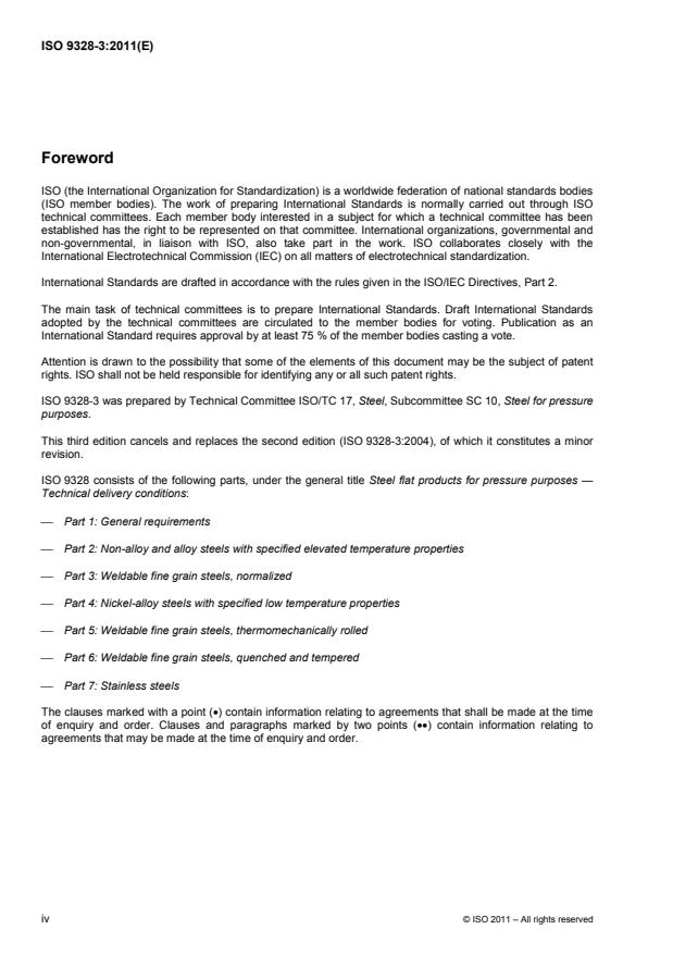 ISO 9328-3:2011 is a standard published by the International Organization for Standardization (ISO). Its full title is "Steel flat products for pressure purposes — Technical delivery conditions — Part 3: Weldable fine grain steels, normalized". This standard covers: ISO 9328-3:2011 specifies the requirements for flat products for pressure equipment made of weldable fine grain steels. The requirements and definitions of ISO 9328-1:2011 also apply to ISO 9328-3:2011.