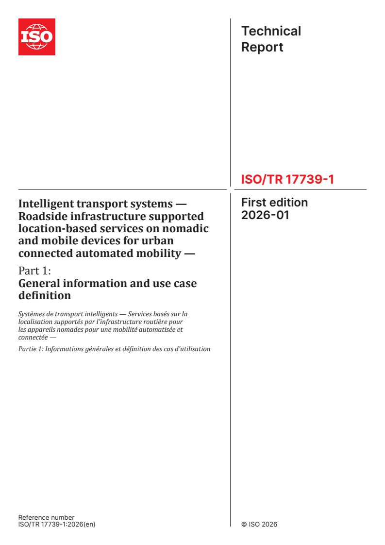 ISO/TR 17739-1:2026 - Intelligent transport systems — Roadside infrastructure supported location-based services on nomadic and mobile devices for urban connected automated mobility — Part 1: General information and use case definition Released:16. 01. 2026