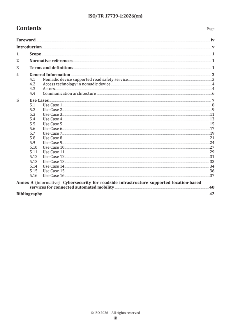 ISO/TR 17739-1:2026 is a technical report published by the International Organization for Standardization (ISO). Its full title is "Intelligent transport systems — Roadside infrastructure supported location-based services on nomadic and mobile devices for urban connected automated mobility — Part 1: General information and use case definition". This standard covers: This document defines general information and use cases for providing road safety enhancement services to all types of road users with a nomadic device in urban localized areas by sharing status or intent messages between nomadic device users and conventional ITS stations. The road users in this document include all type of road users with nomadic device such as vulnerable road users (VRU) including pedestrians, bicyclists, kickboard users, as well as connected automated mobility users including conventional vehicles, automated or connected driving system equipped vehicles. In addition, this document considers a sensor-equipped roadside ITS station with AI-supported road user behaviour detection function to support overall road safety enhancement services by sharing status or intents information of all type of road users such as VRUs without a nomadic device and road vehicles without equipped ITS stations. This document also specifies general information, such as category of nomadic device supported road safety service, overall access technology in nomadic device, actors, and communication architecture to support use cases. This document also defines safety enhancement use cases to enhance overall road safety of all types of road users with nomadic device as well as road users without nomadic device with a connectivity of sensor-equipped roadside ITS station. The use cases are applicable to provide road safety enhancement service in a specific urban localized area such as an un-signalized intersection, T-intersection, roundabout, low speed zone, school zone, no turn on red zone, weaving area, etc.