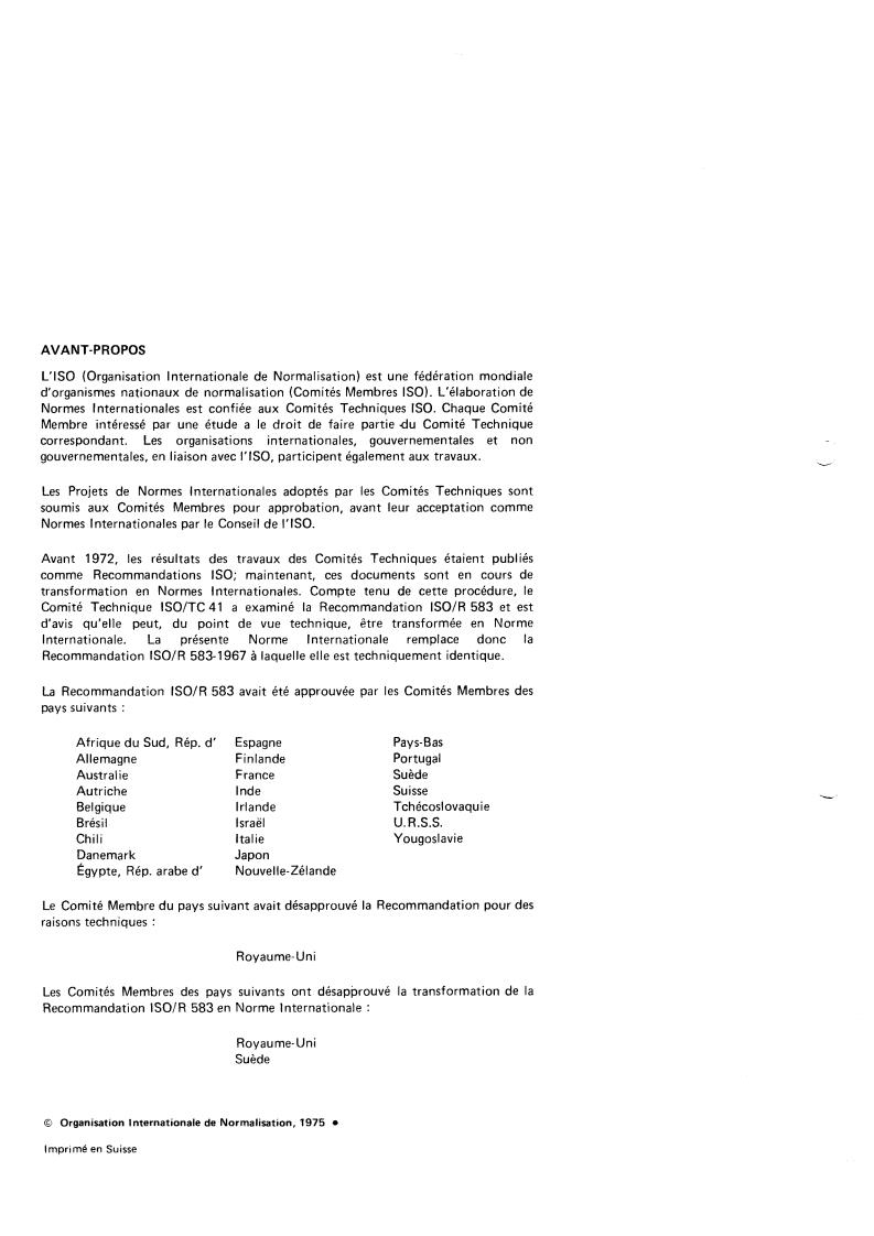 IS0 Recommendation R 583 was approved by the Member Bodies of the following