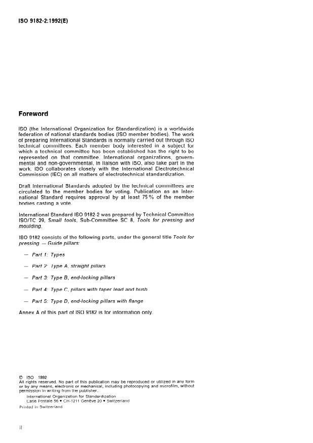 ISO 9182-2:1992 is a standard published by the International Organization for Standardization (ISO). Its full title is "Tools for pressing — Guide pillars — Part 2: Type A, straight pillars". This standard covers: Specifies the dimensions and tolerances, gives guidance on materials, and specifies the hardness and the designation. Those guide pillars may be of type A1, straight, or of type A2, straight with end-locking and locking ring.