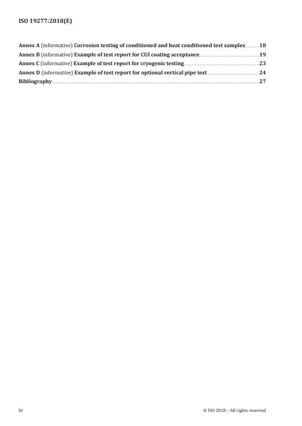 - Test methods and procedures: Specifies laboratory tests and accelerated protocols including adhesion testing, artificial ageing, thermal cycling, multi-phase CUI cyclic corrosion tests, and optional vertical pipe and cryogenic tests. Details on test panels, substrate preparation, sampling, conditioning, scribe, and reporting are included.