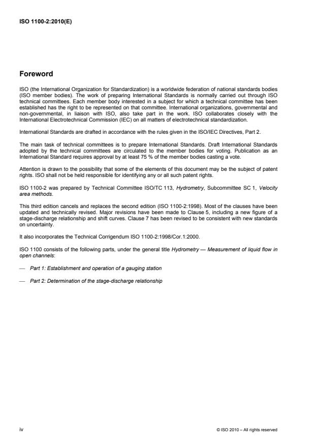 ISO 1100-2:2010 is a standard published by the International Organization for Standardization (ISO). Its full title is "Hydrometry — Measurement of liquid flow in open channels — Part 2: Determination of the stage-discharge relationship". This standard covers: ISO 1100-2:2010 specifies methods of determining the stage-discharge relationship for a gauging station. A sufficient number of discharge measurements, complete with corresponding stage measurements, are required to define a stage-discharge relationship to the accuracy required by ISO 1100-2. Stable and unstable channels are considered, including brief descriptions of the effects on the stage-discharge relationship of shifting controls, variable backwater and hysteresis. Methods of determining discharge for twin-gauge stations, ultrasonic velocity-measurement stations, electromagnetic velocity-measurement stations and other complex rating curves are not described in detail. These types of rating curve are described separately in other International Standards, Technical Specifications and Technical Reports, which are listed in ISO 1100-2.