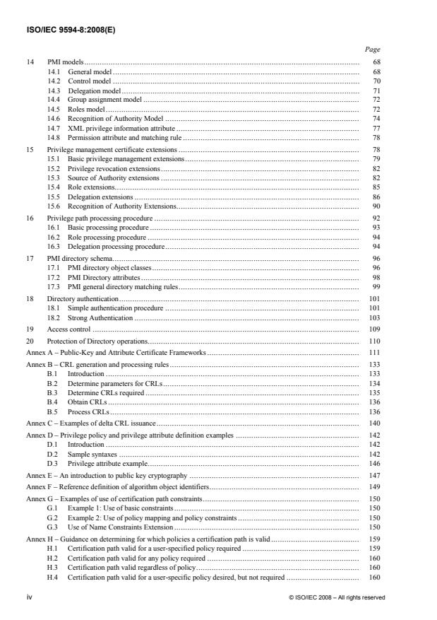 ISO/IEC 9594-8:2008 addresses some of the security requirements in the areas of authentication and other security services through the provision of a set of frameworks upon which full services can be based. Specifically, it defines frameworks for: Public-key certificates; Attribute certificates; Authentication services. The public-key certificate framework defined in ISO/IEC 9594-8:2008 includes definition of the information objects for Public Key Infrastructure (PKI), including public-key certificates, and Certificate Revocation List (CRL). The attribute certificate framework includes definition of the information objects for Privilege Management Infrastructure (PMI), including attribute certificates, and Attribute Certificate Revocation List (ACRL). ISO/IEC 9594-8:2008 also provides the framework for issuing, managing, using and revoking certificates. An extensibility mechanism is included in the defined formats for both certificate types and for all revocation list schemes. ISO/IEC 9594-8:2008 also includes a set of standard extensions for each, which is expected to be generally useful across a number of applications of PKI and PMI. The schema components (including object classes, attribute types and matching rules) for storing PKI and PMI objects in the Directory are included in ISO/IEC 9594-8:2008. Other elements of PKI and PMI, beyond these frameworks, such as key and certificate management protocols, operational protocols, additional certificate and CRL extensions, are expected to be defined by other standards bodies (e.g. ISO/TC 68 and IETF). The authentication scheme defined in ISO/IEC 9594-8:2008 is generic and can be applied to a variety of applications and environments. The Directory makes use of public-key certificates and attribute certificates, and the framework for the Directory's use of these facilities is also defined in ISO/IEC 9594-8:2008. Public-key technology, including certificates, is used by the Directory to enable strong authentication, signed and/or encrypted operations, and for storage of signed and/or encrypted data in the Directory. Attribute certificates can be used by the Directory to enable rule-based access control. Although the framework for these is provided in this Specification, the full definition of the Directory's use of these frameworks, and the associated services provided by the Directory and its components, is supplied in the complete set of Directory Specifications. ISO/IEC 9594-8:2008, in the Authentication services framework, also: specifies the form of authentication information held by the Directory; describes how authentication information may be obtained from the Directory; states the assumptions made about how authentication information is formed and placed in the Directory; defines three ways in which applications may use this authentication information to perform authentication and describes how other security services may be supported by authentication. ISO/IEC 9594-8:2008 describes two levels of authentication: simple authentication, using a password as a verification of claimed identity; and strong authentication, involving credentials formed using cryptographic techniques. While simple authentication offers some limited protection against unauthorized access, only strong authentication should be used as the basis for providing secure services. It is not intended to establish this as a general framework for authentication, but it can be of general use for applications that consider these techniques adequate. Authentication (and other security services) can only be provided within the context of a defined security policy. It is a matter for users of an application to define their own security policy, which may be constrained by the services provided by a standard. It is a matter for standards-defining applications that use the authentication framework to specify the protocol exchanges which need to be performed in order to achieve authentication base