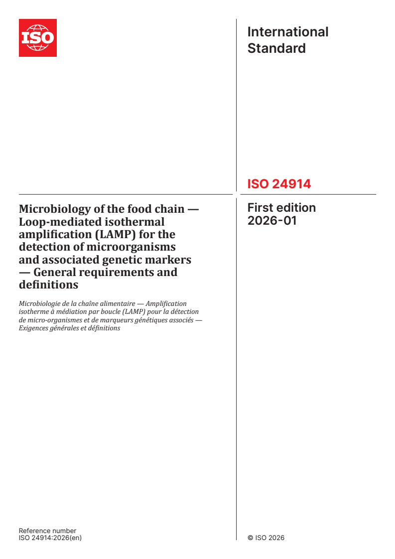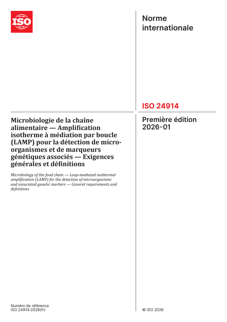 ISO 24914:2026 - Microbiologie de la chaîne alimentaire — Amplification isotherme à médiation par boucle (LAMP) pour la détection de micro-organismes et de marqueurs génétiques associés — Exigences générales et définitions Released:13. 01. 2026