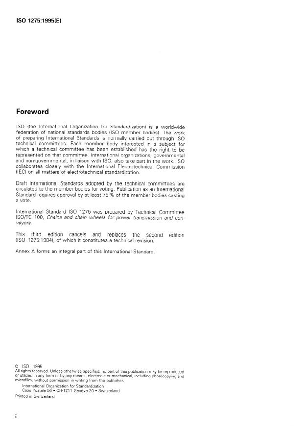 ISO 1275:1995 is a standard published by the International Organization for Standardization (ISO). Its full title is "Double-pitch precision roller chains and sprockets for transmission and conveyors". This standard covers: Cancels and replaces the second edition (1984). Specifies requirements for double-pitch precision roller chains suitable for the mechanical transmission of power and for conveyors, together with those for their associated sprockets. Covers dimensions, tolerances, length measurement, proof testing and minimum tensile strengths. The chains are intended for use under less onerous conditions with respect to speed and power transmitted than are the base chains from which they are derived.