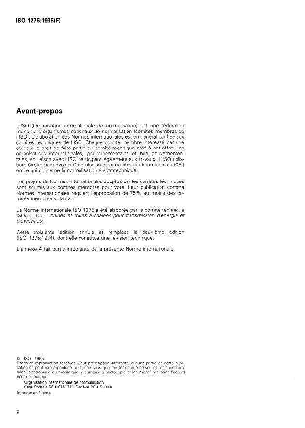ISO 1275:1995 - Chaînes de précision a rouleaux a pas double et roues dentées pour transmission et manutention