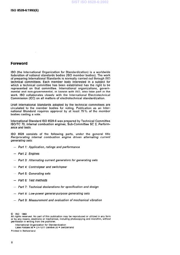 ISO 8528-6:1993 is a standard published by the International Organization for Standardization (ISO). Its full title is "Reciprocating internal combustion engine driven alternating current generating sets — Part 6: Test methods". This standard covers: Specifies the test methods for the characteristics of the complete generating set. The test methods existing for the engines (ISO 3046-2 and ISO 3046-3) and generators (IEC 34-2) may be used for their components. Applies to a.c. generating sets for land and marine use, excluding generating sets used on aircraft or to propel land vehicles and locomotives. For some specific applications (e.g. essential hospital supplies, high-rise buildings, etc.) supplementary requirements may be necessary.