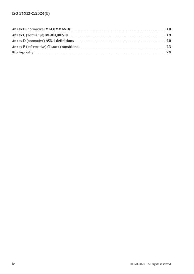 - Conformance statements, test methods, normative annexes with CI parameters, ASN.1 definitions, MI messages and state transition guidance.