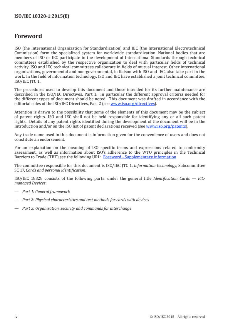 Keywords: ISO/IEC 18328-1, ICC-managed devices, identification cards, card-IC, COS, smart cards, electronic display, biometric capture, interoperability, card operating system.
