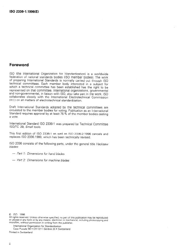 - Reference and revision history: First edition (1996) replaces ISO 2336:1980 and is published alongside ISO 2336-2:1996 (machine blades).