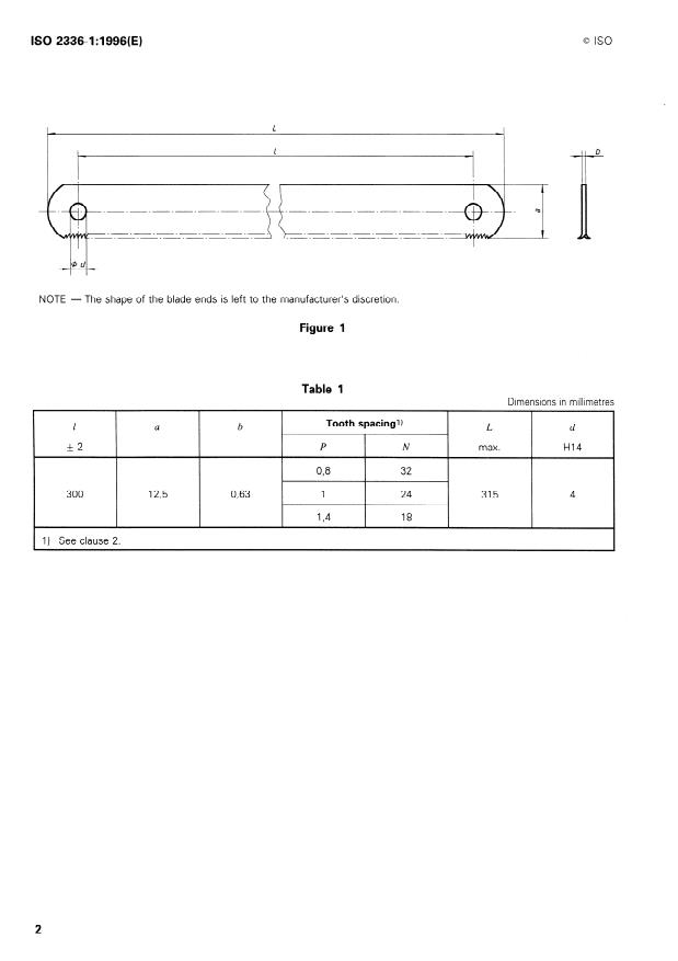 Keywords: ISO 2336-1:1996, hacksaw blades, hand blades, blade dimensions, tooth pitch, blade length, blade thickness, designation, standards for hacksaw blades.