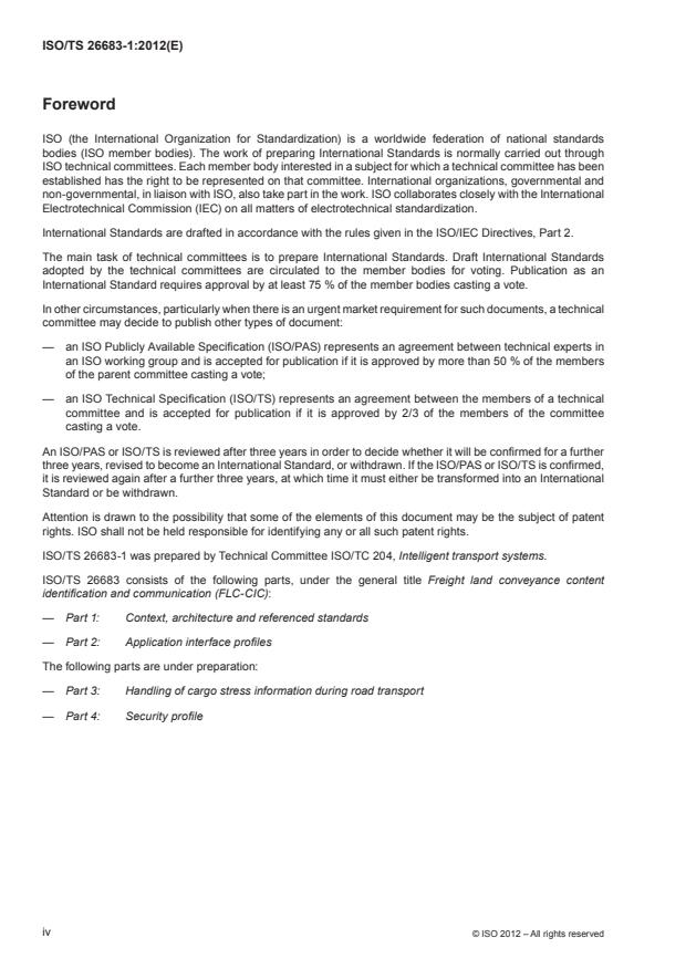 ISO/TS 26683-1:2012 is a technical specification published by the International Organization for Standardization (ISO). Its full title is "Intelligent transport systems — Freight land conveyance content identification and communication (FLC-CIC) — Part 1: Context, architecture and referenced standards". This standard covers: ISO/TS 26683-1:2012 provides the context for application interface profiles for the exchange of land transport data using current technologies and existing standards for item identification, package identification, container identification, and international standards and practices regarding freight and its movement. ISO/TS 26683-1:2012 provides the following: a context of the relationship between ISO 26683 and other freight and fleet standards and defines the objectives for the ISO 26683 series. The explanation is provided as to how existing International Standards and Technical Specifications can be utilized to agglomerate/aggregate data concepts by using standardized application interface profiles and utilize them within the context of ISO 26683 and how ISO 26683 can be used to provide information/data to cargo management systems; descriptions of use cases of providing information to cargo tracking and tracing in end-to-end transport by exploiting identifiers, data carriers, EDI messages and data elements with respect to various types of cargo and transport means within an international intermodal/multimodal cargo movement context; an architecture for the collation and transfer of data agglomerated/aggregated from information contained in the transport load to transport operating systems, the objective being to enable efficient handling of truck/trailer identification and on-board cargo information for tracking, tracing and cargo monitoring purposes in a land cargo transport situation.