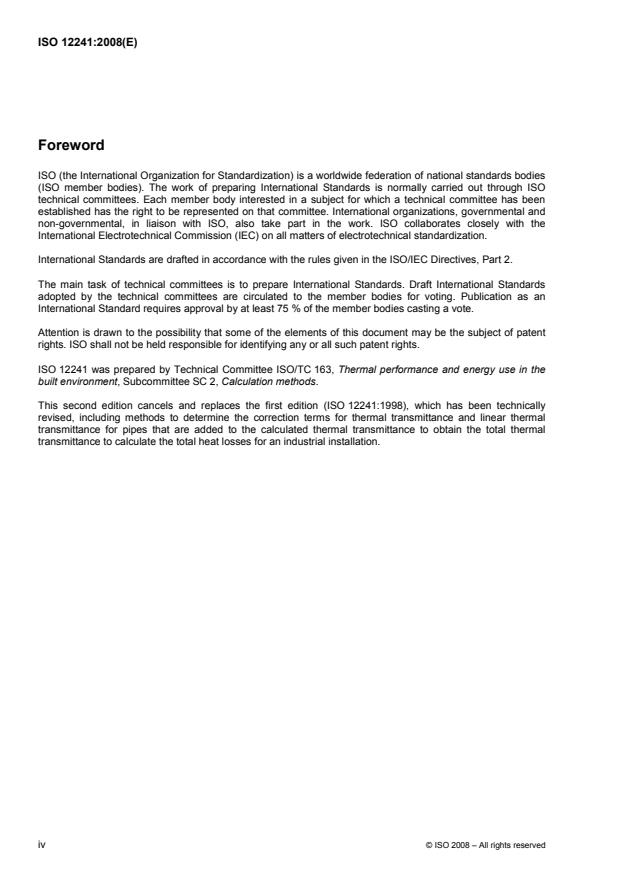 ISO 12241:2008 gives rules for the calculation of heat-transfer-related properties of building equipment and industrial installations, predominantly under steady-state conditions. ISO 12241:2008 also gives a simplified approach for the treatment of thermal bridges.