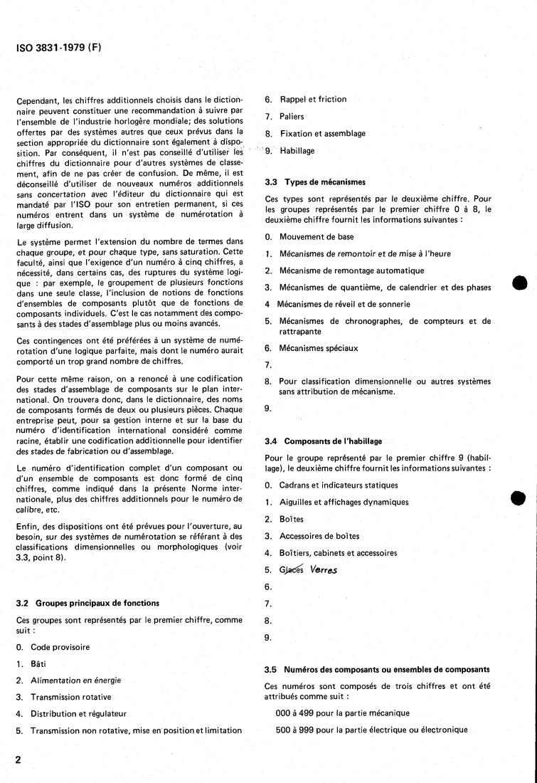 ISO 3831:1979 is a standard published by the International Organization for Standardization (ISO). Its full title is "Timekeeping instruments — Classification and numbering system and nomenclature of components for watches and clocks". This standard covers: Timekeeping instruments — Classification and numbering system and nomenclature of components for watches and clocks