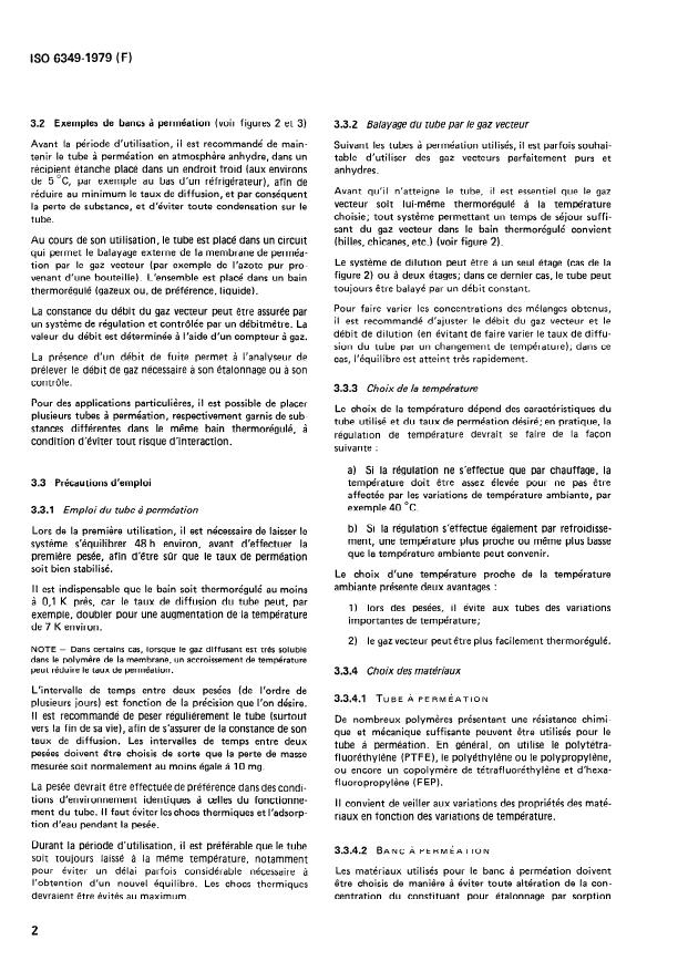 ISO 6349:1979 is a standard published by the International Organization for Standardization (ISO). Its full title is "Gas analysis — Preparation of calibration gas mixtures — Permeation method". This standard covers: Describes the principles of the method, which is a continuous dynamic method, for the preparation of gas mixtures in which the components that is desired to use generally have a concentration between 10-9 and 10-5 (by volume) with an achievable accuracy of 2 % of the concentration of the component.