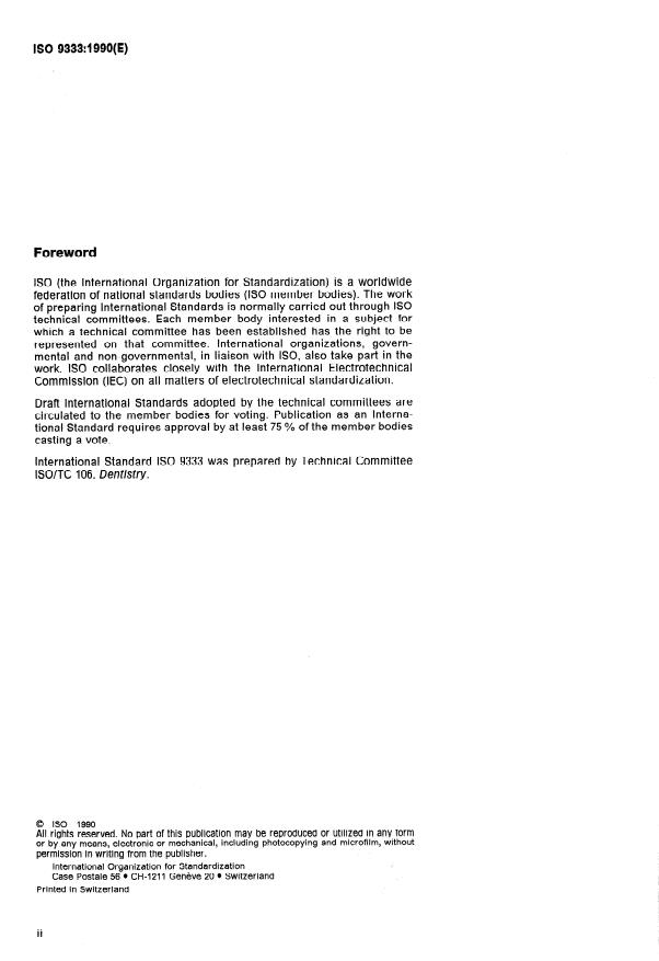 ISO 9333:1990 is a standard published by the International Organization for Standardization (ISO). Its full title is "Dentistry -Brazing materials". This standard covers: Specification of requirements and test methods for brazing materials suitable for use in brazing cast dental restorations. Important terms are defined. Specific qualitative and quantitative requirements for freedom from biological hazard are not included.
