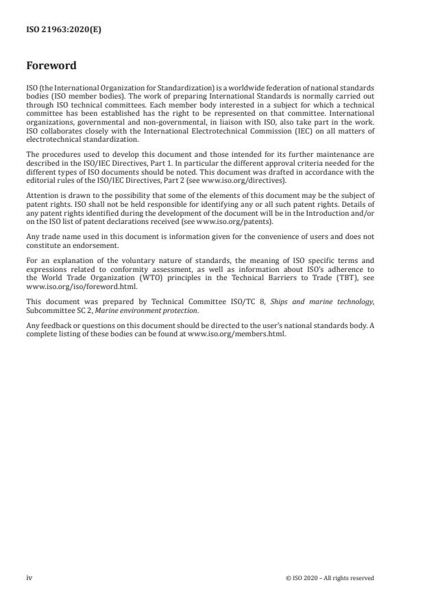 ISO 21963:2020 is a standard published by the International Organization for Standardization (ISO). Its full title is "Ships and marine technology — Marine environment protection — Tanks and piping systems for facilitating 5 ppm oil-water separation". This standard covers: This document provides requirements and test methods for tanks, piping and separation systems facilitating the separation of contaminated fluids of oil and water on fixed offshore marine structures and ships, where treatment is performed by separation systems that optimize oil-water separation to a concentration equal to or less than 5 ppm. It is applicable to fixed offshore marine structures and to ships operating in designated sea areas determined by the relevant authorities.