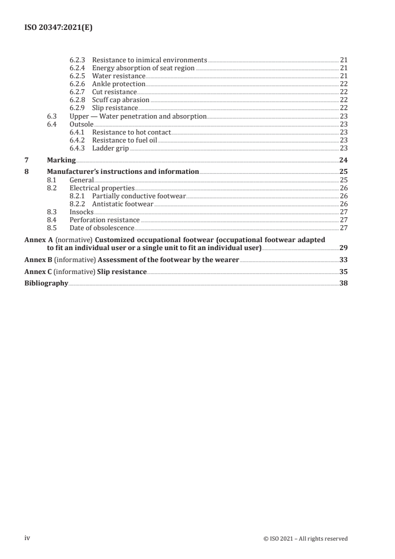 - Annexes: Annex A (customized occupational footwear), Annex B (assessment by wearer), Annex C (slip resistance).
