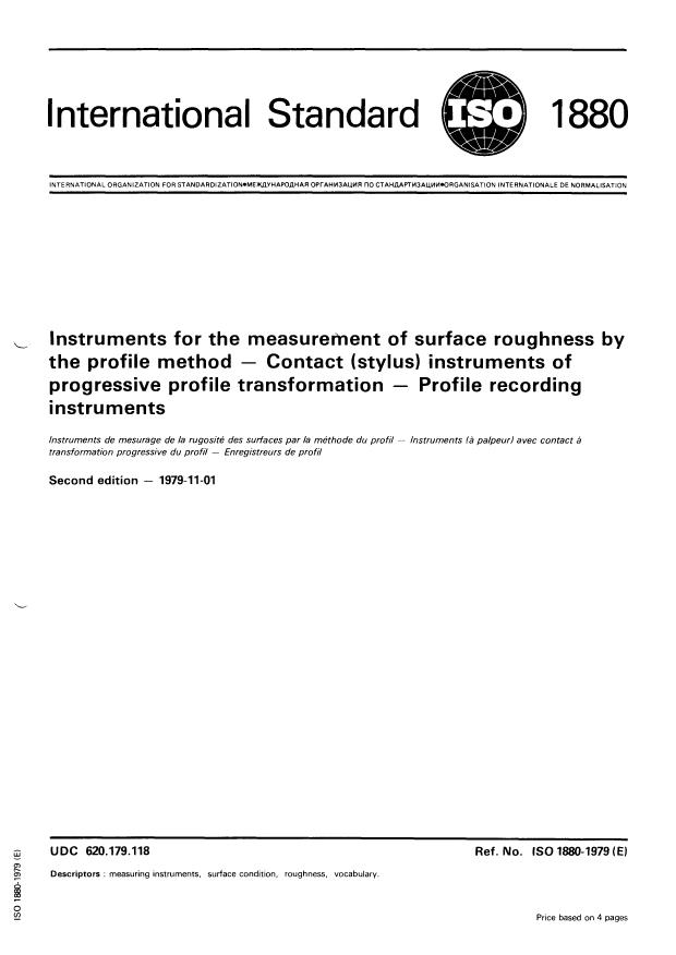 ISO 1880:1979 is a standard published by the International Organization for Standardization (ISO). Its full title is "Instruments for the measurement of surface roughness by the profile method — Contact (stylus) instruments of progressive profile transformation — Profile recording instruments". This standard covers: Instruments for the measurement of surface roughness by the profile method — Contact (stylus) instruments of progressive profile transformation — Profile recording instruments