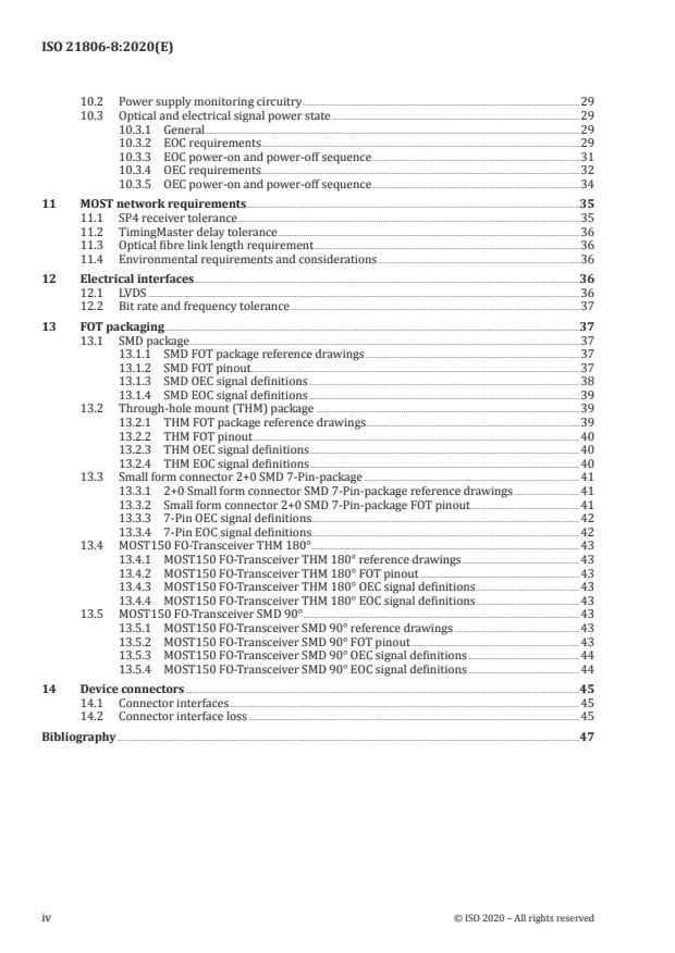 ISO 21806-8:2020 addresses the physical‑layer characteristics and conformance requirements needed to build interoperable MOST150 optical links. Major technical topics include: