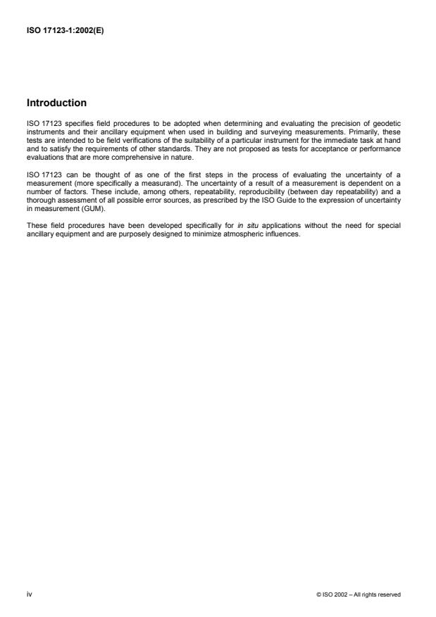 ISO 17123-1:2002 is a standard published by the International Organization for Standardization (ISO). Its full title is "Optics and optical instruments — Field procedures for testing geodetic and surveying instruments — Part 1: Theory". This standard covers: This part of ISO 17123 gives the theory used in the specification of the test procedures of the other parts of ISO 17123. These procedures assume the use of measuring methods in which systematic influences can be largely compensated or disregarded.