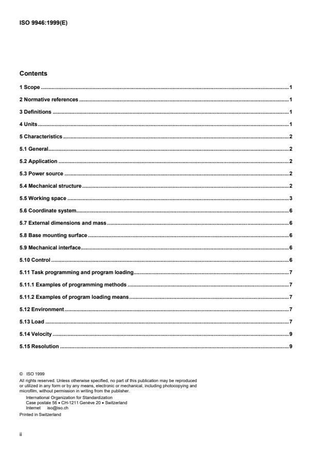 Keywords: ISO 9946:1999, manipulating industrial robots, presentation of characteristics, robot specifications, working space, performance criteria, mechanical interface, robot control, ISO 9283, ISO 10218.
