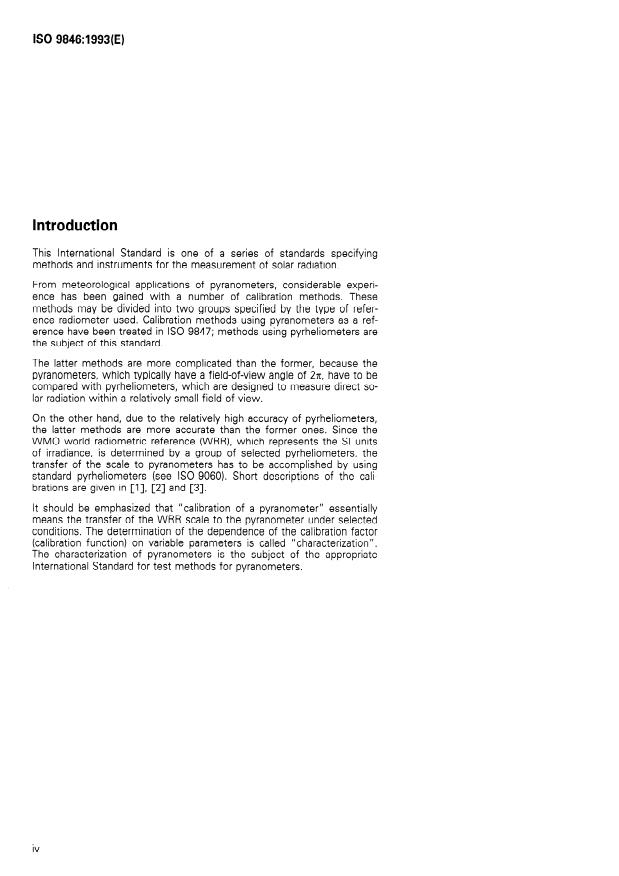 ISO 9846:1993 is a standard published by the International Organization for Standardization (ISO). Its full title is "Solar energy - Calibration of a pyranometer using a pyrheliometer". This standard covers: Its use is mandatory for the calibration of secondary standard pyranometers according to ISO 9060, and is recommended for the calibration of pyranometers which are used as reference instruments in comparisons. Is intended for use by test institutions or test laboratories equipped with well-maintained pyrheliometers and is applicable to all pyranometers. The object is to promote the uniform application of reliable methods to calibrate pyranometers, since accurate calibration factors are the basis of accurate hemispherical solar radiation data which are needed for solar energy test applications or simulations.